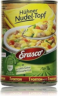 Erasco Lübecker Hochzeitssuppe , 390 ml 169€ (4,33 €/l) Erasco Hühner Nudel-Topf (1 x 400 g Dose) 154€ (3,85 €/kg) Gesamtpreis: 7,70 € Alle drei in den Einkaufswagen Einige dieser Artikel sind schneller versandfertig als andere. Details anzeigen Weitere Artikel entdecken Seite 1 von 1 Zum Anfang Erasco Rindfleisch-Nudeltopf, 400 g 69 Erasco Hühner-Nudelsuppe 390ml bei REWE online bestellen! Inspirationswelten Nahrungsmittel Fertiggerichte & Konserven Dosengerichte & Eintöpfe Hühnereintopf Erasco Hühner-Nudelsuppe 390ml Hühner-Nudelsuppe mit 78% Hühnerbrühe Marke: Erasco W Erasco Konkreter Preis abhängig vom Standort Standort wählen 1 °P pro 2 Euro Warenwert Produktbeschreibung