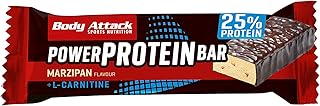 Body Attack Power Protein Bar, 25% Eiweiß, mit L-Carnitin für den Fettstoffwechsel, Vitaminen, fettarm, knackige Schokolade, leckere Protein-Füllung, Made in Germany, 24 x 35g, Marzipan